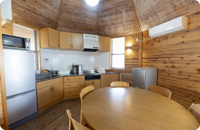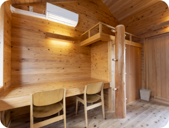 4人用の居室が9室あります。居室には2段ベッドが用意されており、学習デスクも備えられております。天窓があり、各ベッドから夜空の星を眺め、疲れを癒したり宇宙旅行を楽しむことも出来ます。開放廊下を通じて、風が室内を通り抜けます。36名のボランティアの宿泊と学習ができます。